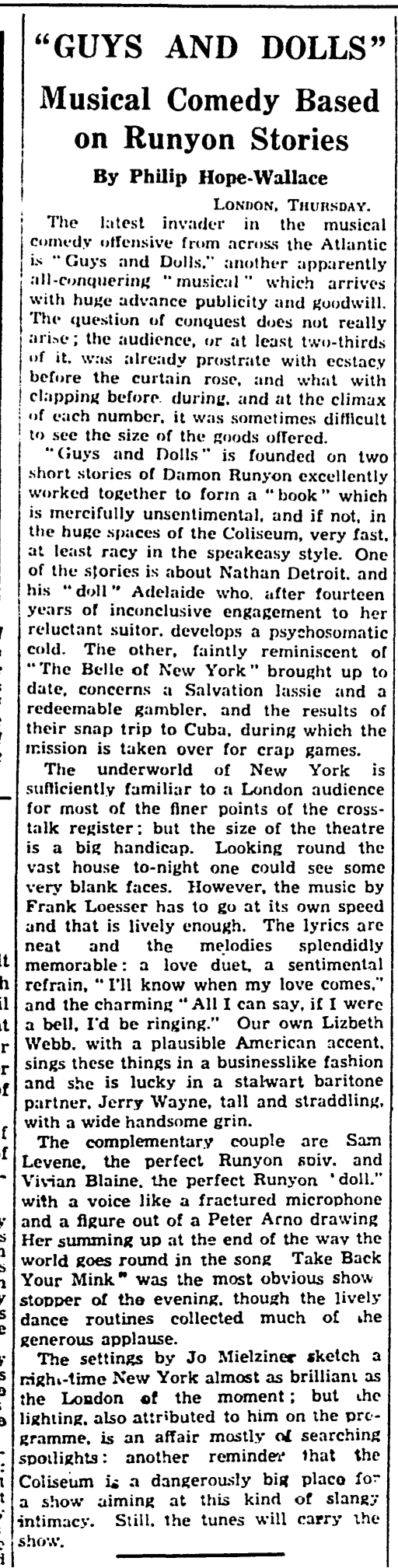 Guys and Dolls - the tunes will carry the show. How lady luck smiled on the seedy side of America.