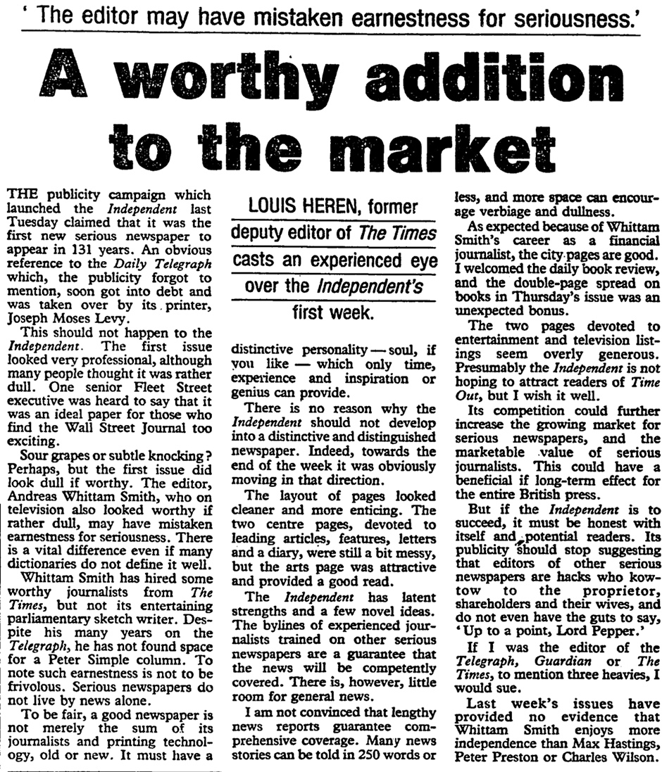 12 October 1986: The Observer is impressed with the new Independent newspaper, but warns that it must be ‘honest with itself’ and stop knocking other editors.
