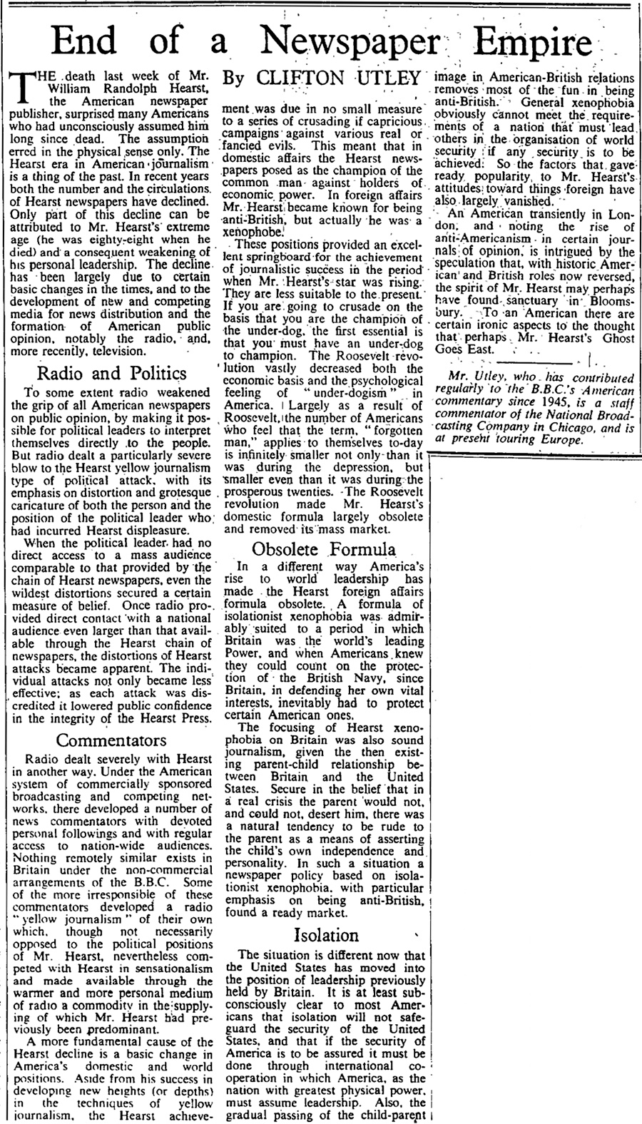 19 August 1951: The death of American magnate William Randolph Hearst marks the end of his ‘yellow journalism of political attack’ which was already under threat from radio. The publisher was the inspiration for Citizen Kane.