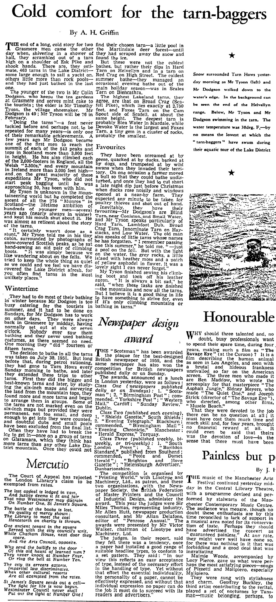 14 November 1959: Cold comfort for the tarn-baggers - ‘shivering in a shower of hail, they scrambled out of a tarn high on a shoulder of Esk Pike [in the Lake District] and shook hands.’ Thus began the practice of tarn bagging.