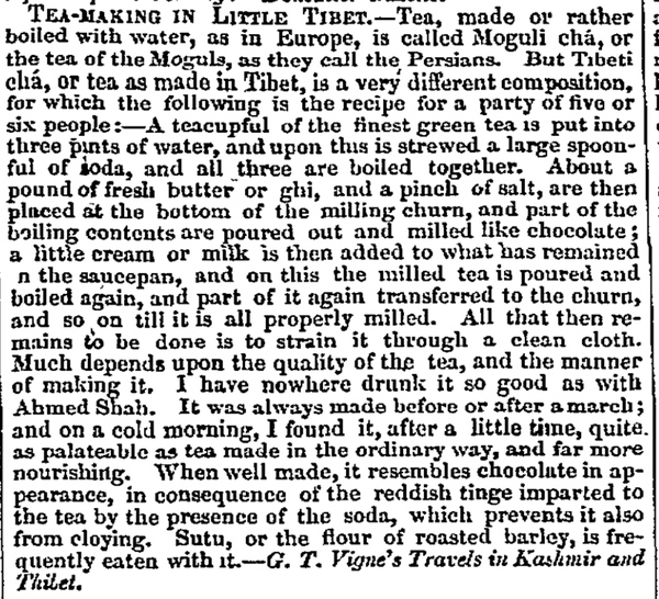 Butter or ghee in your morning tea? That’s how they made it in Nepal, Manchester Guardian readers were told in 1843. The other ingredients used appeared in a new book, G.T Vigne’s Travels in Kashmir, previewed in the Varieties section of the paper.