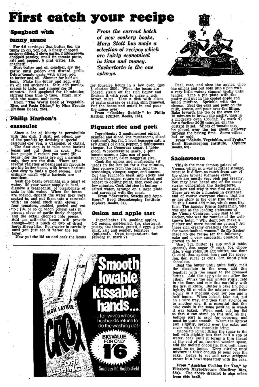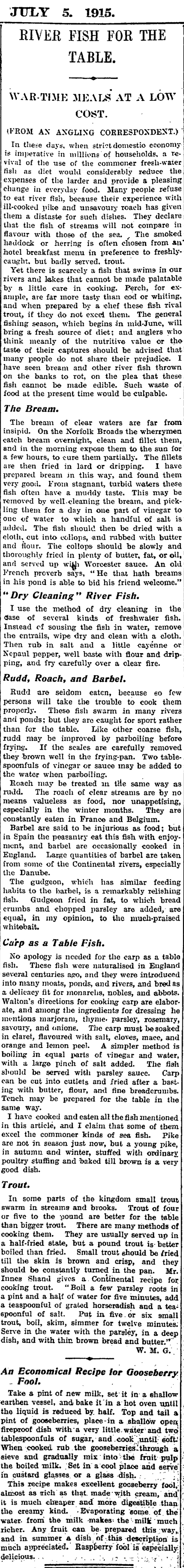 Common freshwater fish made a comeback during the war because it was cheap. This recipe for carp, published in 1915, told readers to pre-soak the fish in cloves, mace, and orange and lemon peel.