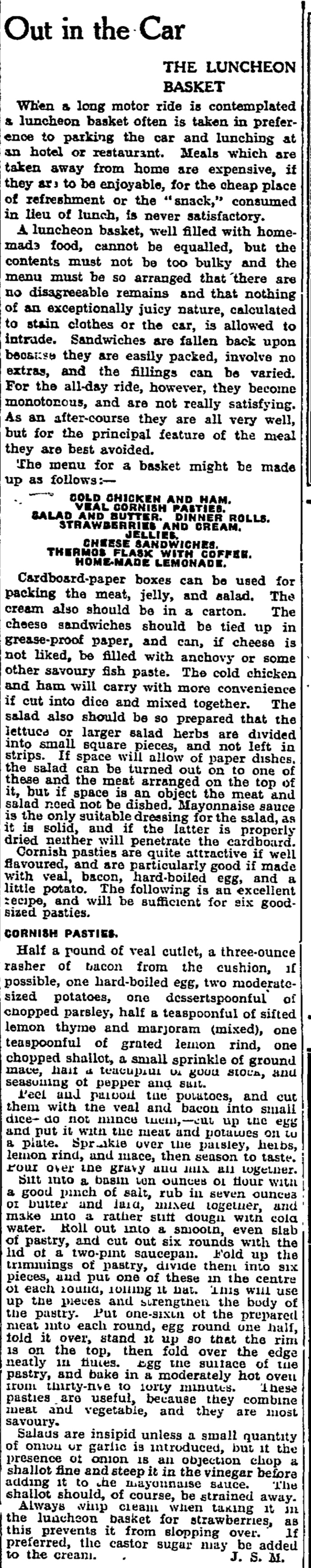 Owning a motor car allowed families to drive to their holiday destination. And in 1928, readers were told that if they wanted to avoid expensive meals en route then preparing delicious snacks, like this veal Cornish pasty, was a good idea.
