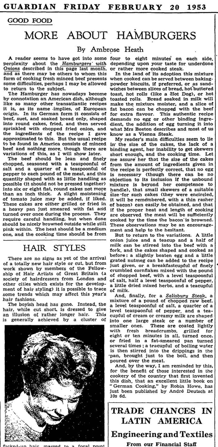 A decade later, meat was easier to come by. This recipe for hamburgers, as well as a bit of history about their origin, appeared in our pages.