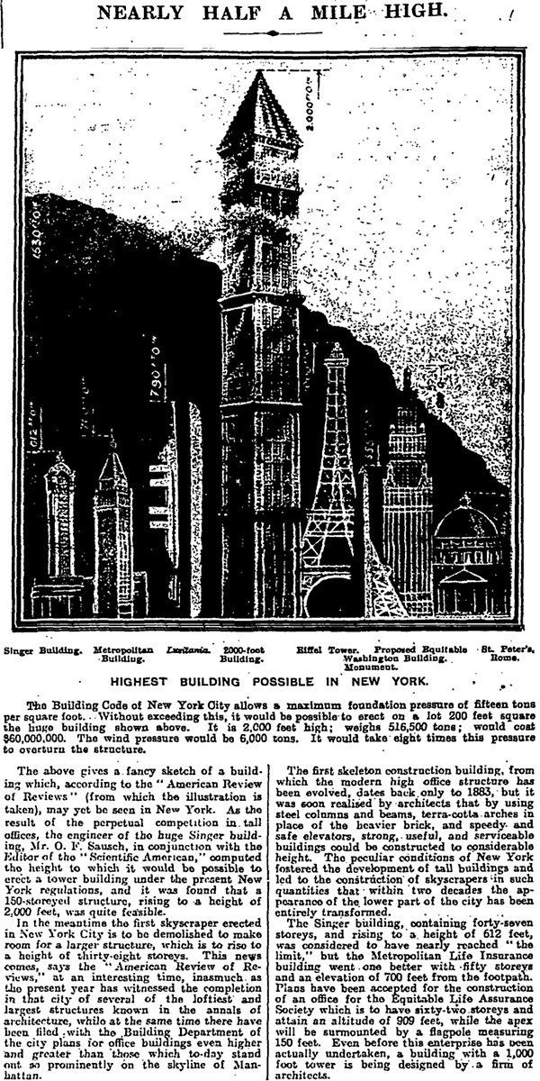 8 November 1908: A 150-storey building of a height of 2000 feet is claimed to be feasible by famous New York engineer, while the first skyscraper in the city is being demolished to give way to a 38 storey building.