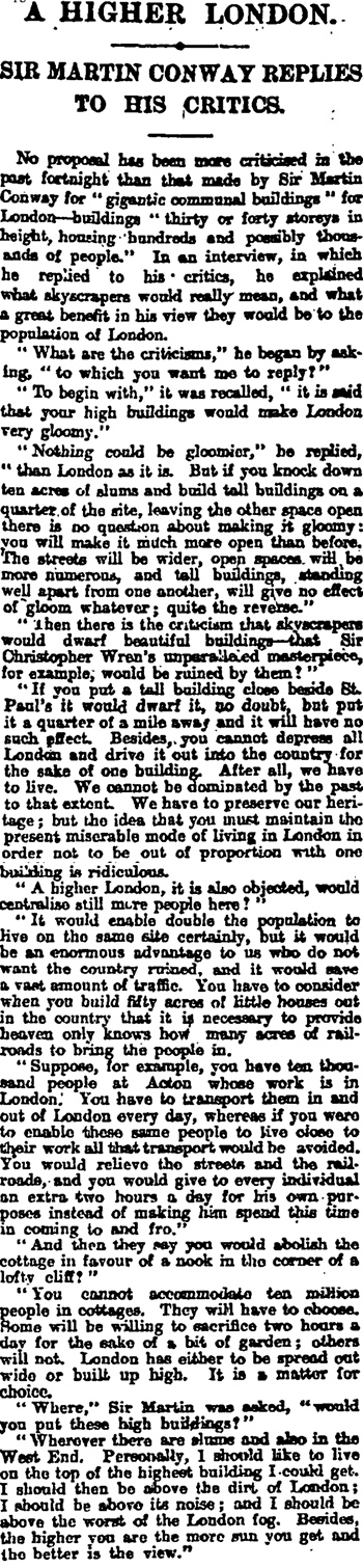 8 February 1920: Sir Martin Conway, advocate of higher buildings in London, replies to his critics and extols the advantages of high living.