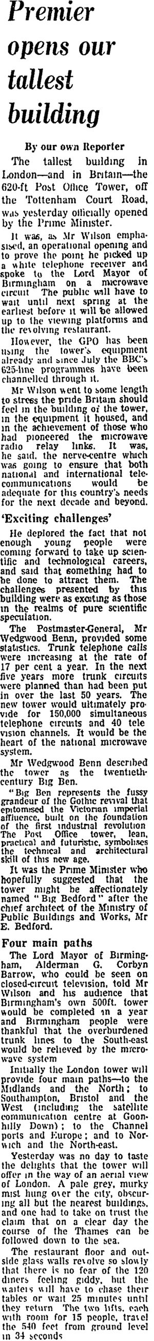 9 October 1965: Harold Wilson opens the tallest building in the UK, the 620 ft Post Office Tower in London. In 1971, an IRA bomb at the Top of the Tower restaurant eventually closed the building to the public.