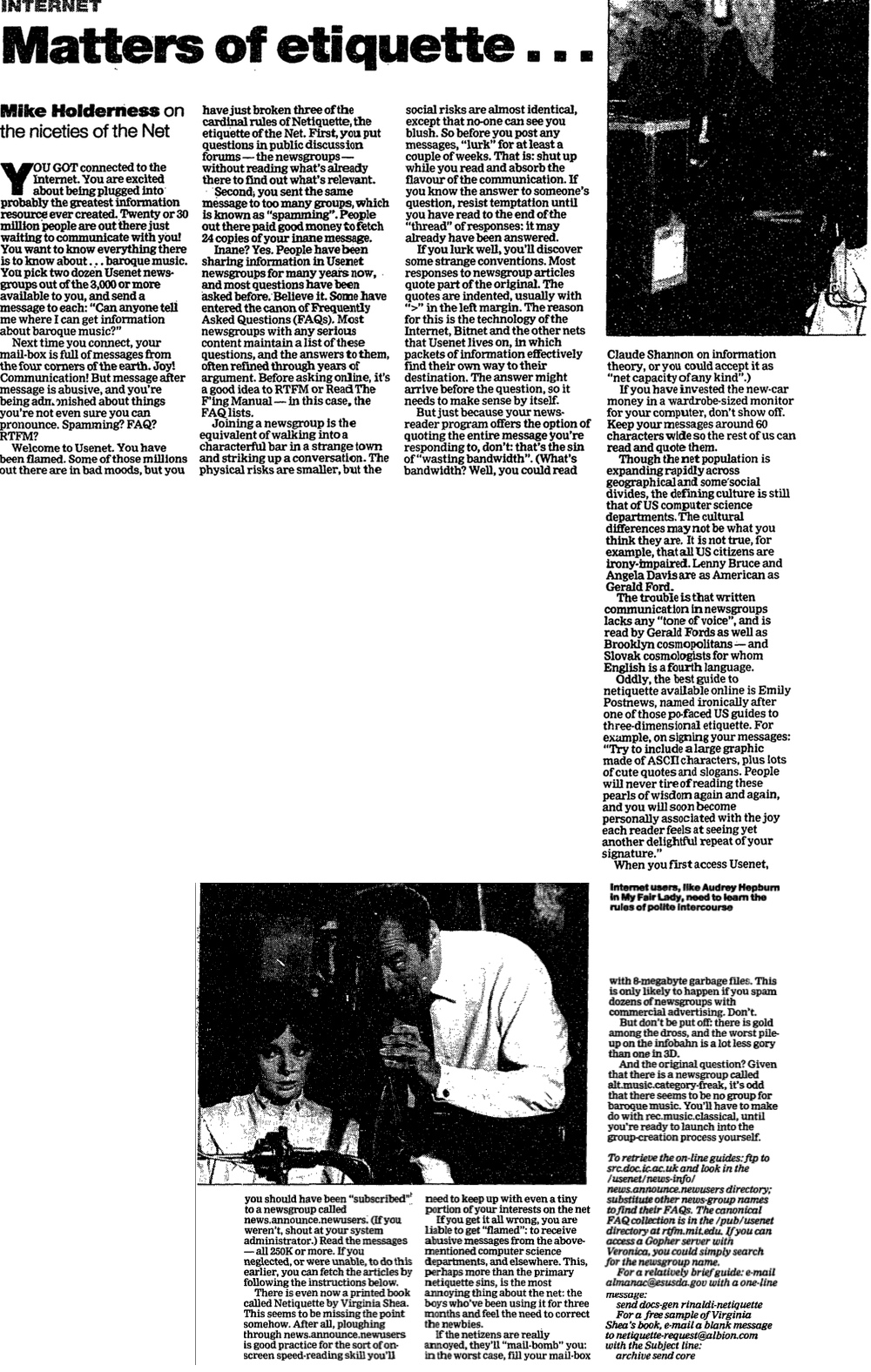 15 September 1994: Netiquette or how to negotiate your way through the 3000 or more Usenet newsgroups available. “Can anyone tell me where I can get information about baroque music?”