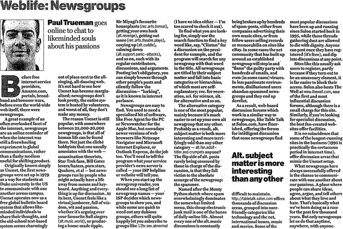 21 October 1999: Newsgroups: Paul Trueman goes online to chat to likeminded souls about his passions. It seems the Alt. subject matter is more interesting than any other.