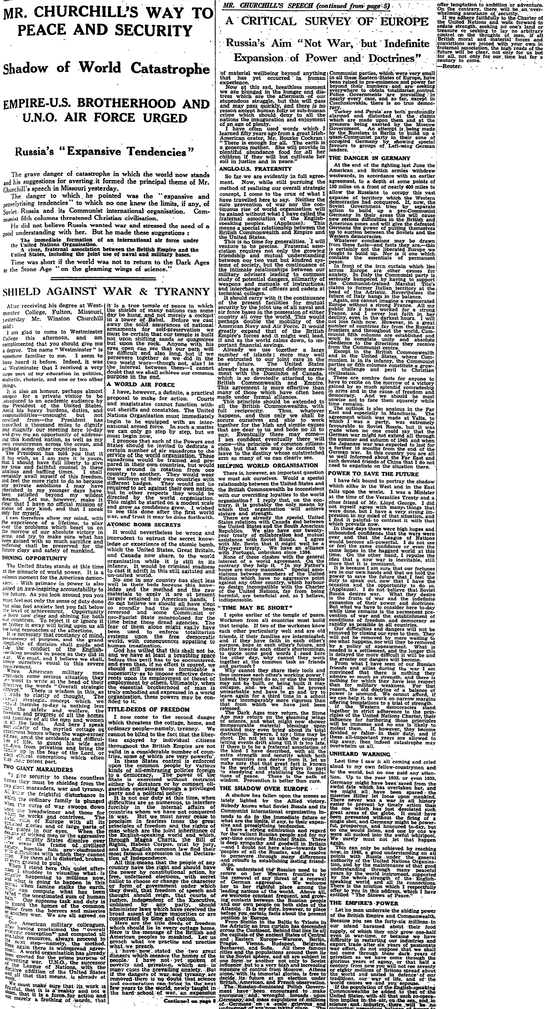 6 March 1946: Competing political influences in Europe are becoming so apparent that the recently ousted Churchill tells an American audience: “From Stettin in the Baltic to Trieste in the Adriatic, an iron curtain has descended across the Continent.” The Manchester Guardian reproduces the speech in full.