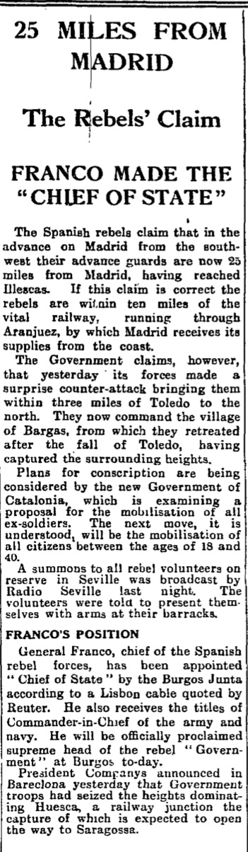 1 October 1936: As the rebels advance on Madrid Franco is declared Chief of State by his forces. Despite the rapid advance, government forces will repel Franco’s forces from the capital until eventual surrender in 1939.