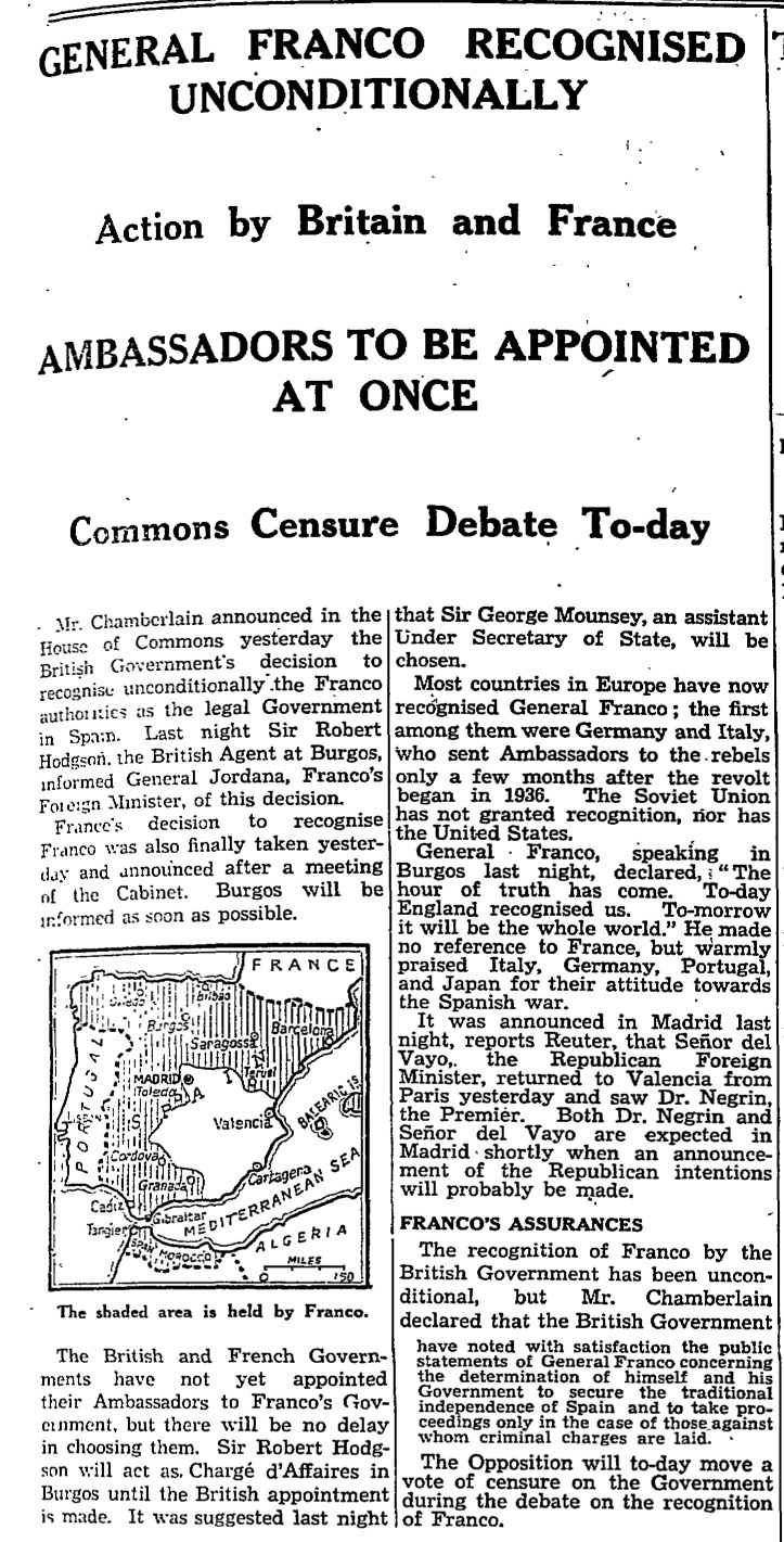 28 February 1939: Britain and France formally recognise the Franco regime. The Guardian prints a map showing Franco’s territorial gains.