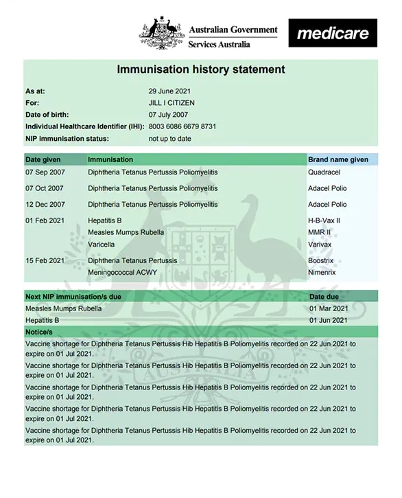 In the statement, you should be able to see your COVID-19 vaccinations — if you've had them — and other vaccinations included in the National Immunisation Program Schedule. This is the standard set of jabs given to Australians when they reach certain ages.