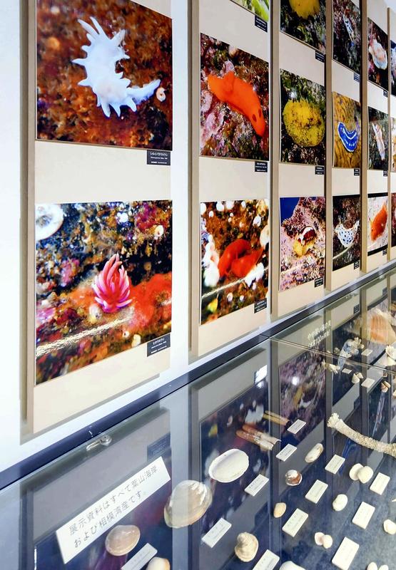 About 600 types of shellfish of different shapes and sizes are displayed in large exhibition cases. The walls are adorned with photo panels showing sea slugs in red, yellow, purple and other vivid colors.