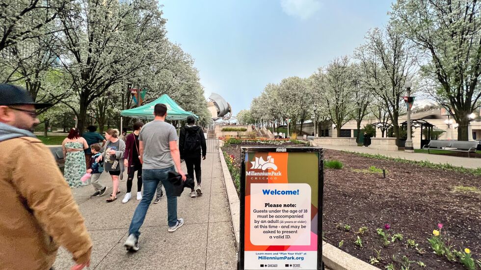 On Thursday evening, few police officers could be seen around Millennium Park as a storm moved across the city. Signs outside the park indicated that those under 18 wouldn’t be allowed past checkpoints without an adult. Guards said few teens had attempted to get in, but said they expected more this weekend.
