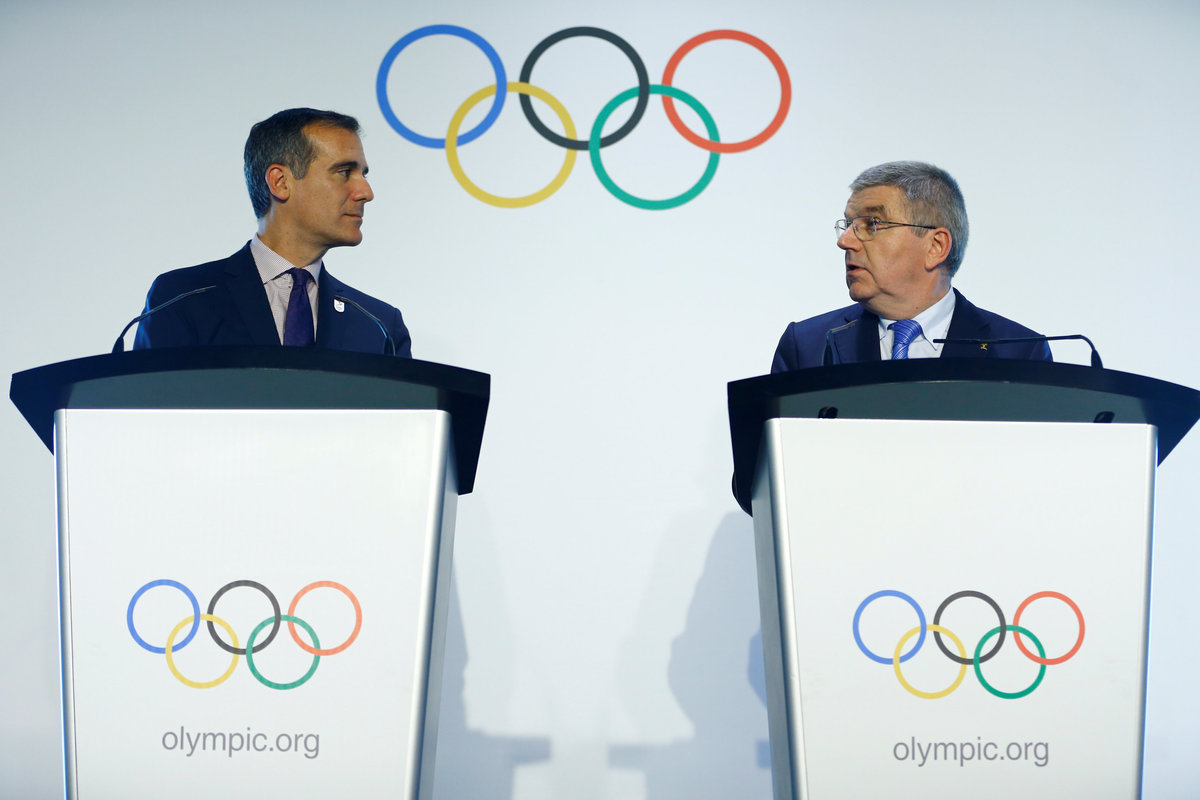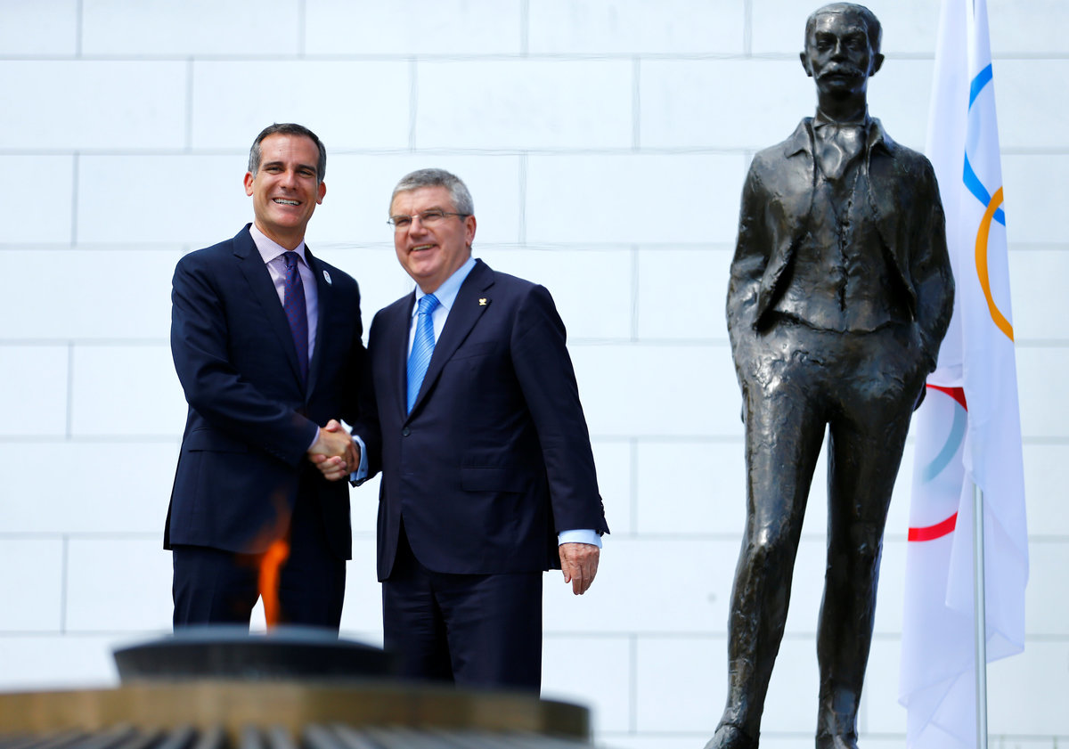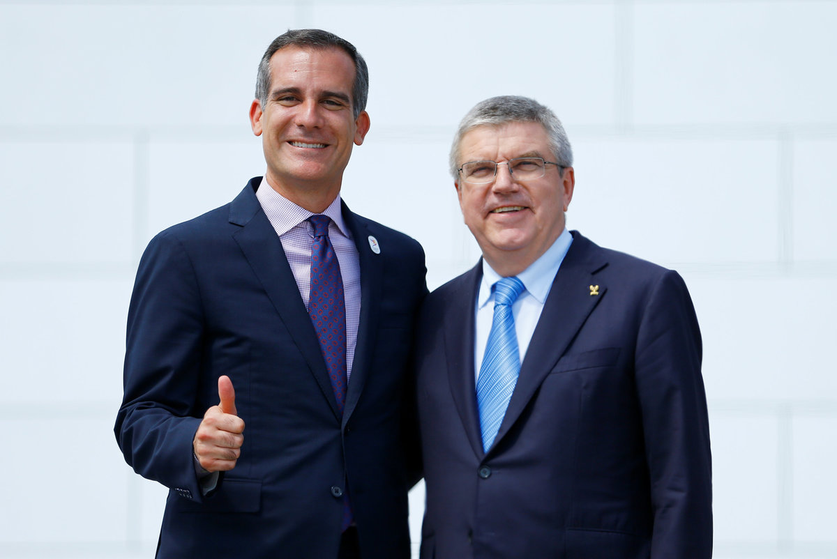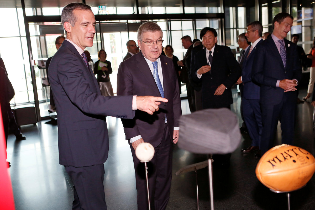 International Olympic Committee (IOC) President Thomas Bach (C) welcomes Mayor of Los Angeles Eric Garcetti (L) from the 2024 candidate city delegation of Los Angeles during the visit of the Olympic Museum in Lausanne, Switzerland, July 10, 2017. REUTERS/Pierre AlbouyInternational Olympic Committee (IOC) President Thomas Bach (R) and Mayor of Los Angeles Eric Garcetti from the 2024 candidate city delegation of Los Angeles pose in front of the Olympic Museum in Lausanne, Switzerland, July 10, 2017. REUTERS/Pierre AlbouyInternational Olympic Committee (IOC) President Thomas Bach (L) and Mayor of Los Angeles Eric Garcetti from the 2024 candidate city delegation of Los Angeles are seen during the signing of the golden book at the Olympic Museum in Lausanne, Switzerland, July 10, 2017. REUTERS/Pierre Albouy
