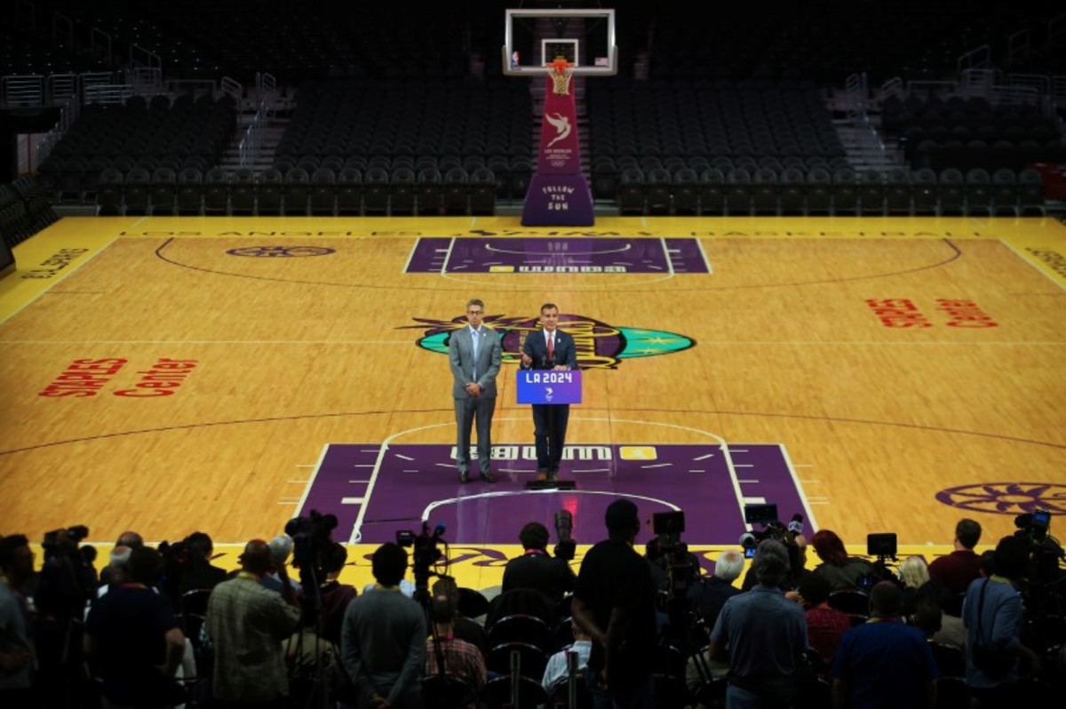 LA 2024 Chairman Casey Wasserman speaks next to Los Angeles Mayor Eric Garcetti on the Lakers home court at the Staples Center during a news conference following a day of meetings with members of the International Olympic Committee Evaluation Commission for the Summer 2024 Olympic Games in Los Angeles, California, May 10, 2017. REUTERS/Mike Blake