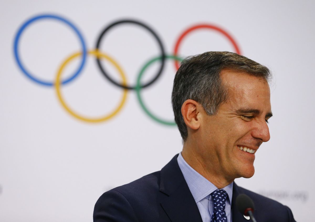 Los Angeles Mayor Eric Garcetti speaks along with LA 2024 Chairman Casey Wasserman during a news conference following three days of meetings and tours with the International Olympic Committee (IOC) Evaluation Commission as part of LA 2024's bid for the Summer 2024 Olympic Games in Los Angeles, California, U.S., May 12, 2017. REUTERS/Mike Blake