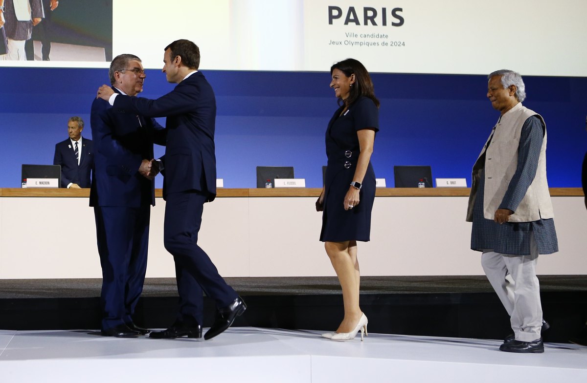 (L-R) Mayor of Los Angeles Eric Garcetti, American sprinter Allyson Felix, International Olympic Committee (IOC) President Thomas Bach and American sprinter Michael Johnson pose in front of the Olympic Museum in Lausanne, Switzerland, July 10, 2017. REUTERS/Pierre Albouy Mayor of Los Angeles Eric Garcetti attends the briefing of 2024 Olympic Games candidate cities Paris and Los Angeles ahead of final election of 2024 Olympic host city, in Lausanne, Switzerland July 11, 2017. REUTERS/Pierre AlbouyFrench President Emmanuel Macron, Paris mayor Anne Hidalgo and French slalom canoeist Tony Estanguet attend the briefing of 2024 Olympic Games candidate cities Paris and Los Angeles ahead of final election of 2024 Olympic host city, in Lausanne, Switzerland July 11, 2017. REUTERS/Pierre AlbouyInternational Olympic Committee (IOC) President Thomas Bach gestures during the IOC extraordinary session in Lausanne, Switzerland July 11, 2017. REUTERS/Pierre Albouy2024 candidate city delegation of Paris led by French President Emmanuel Macron gesture during the briefing of 2024 Olympic Games candidate cities Paris and Los Angeles ahead of final election of 2024 Olympic host city, in Lausanne, Switzerland July 11, 2017. REUTERS/Pierre AlbouyFrench President Emmanuel Macron and French slalom canoeist Tony Estanguet attend the press conference after the briefing of 2024 Olympic Games candidate cities Paris and Los Angeles ahead of final election of 2024 Olympic host city, in Lausanne, Switzerland July 11, 2017. REUTERS/Pierre AlbouyU.S. International Olympic Committee (IOC) member Angela Ruggiero, Mayor of Los Angeles Eric Garcetti and Chairman of the LA 2024 Candidature Committee Casey Wasserman attend the briefing of 2024 Olympic Games candidate cities Paris and Los Angeles ahead of final election of 2024 Olympic host city, in Lausanne, Switzerland July 11, 2017. REUTERS/Pierre Albouy2024 candidate city delegation of Los Angeles led by Mayor of Los Angeles Eric Garcetti attends the briefing of 2024 Olympic Games candidate cities Paris and Los Angeles ahead of final election of 2024 Olympic host city, in Lausanne, Switzerland July 11, 2017. REUTERS/Pierre AlbouyFrench President Emmanuel Macron and French slalom canoeist Tony Estanguet attend the briefing of 2024 Olympic Games candidate cities Paris and Los Angeles ahead of final election of 2024 Olympic host city, in Lausanne, Switzerland July 11, 2017. REUTERS/Pierre AlbouyInternational Olympic Committee (IOC) President Thomas Bach welcomes French President Emmanuel Macron and French delegation at the briefing of 2024 Olympic Games candidate cities Paris and Los Angeles ahead of final election of 2024 Olympic host city, in Lausanne, Switzerland July 11, 2017. REUTERS/Pierre AlbouyFrench President Emmanuel Macron attends the briefing of 2024 Olympic Games candidate cities Paris and Los Angeles ahead of final election of 2024 Olympic host city, in Lausanne, Switzerland July 11, 2017. REUTERS/Pierre AlbouyInternational Olympic Committee (IOC) President Thomas Bach is seen during the IOC extraordinary session in Lausanne, Switzerland July 11, 2017. REUTERS/Pierre Albouy