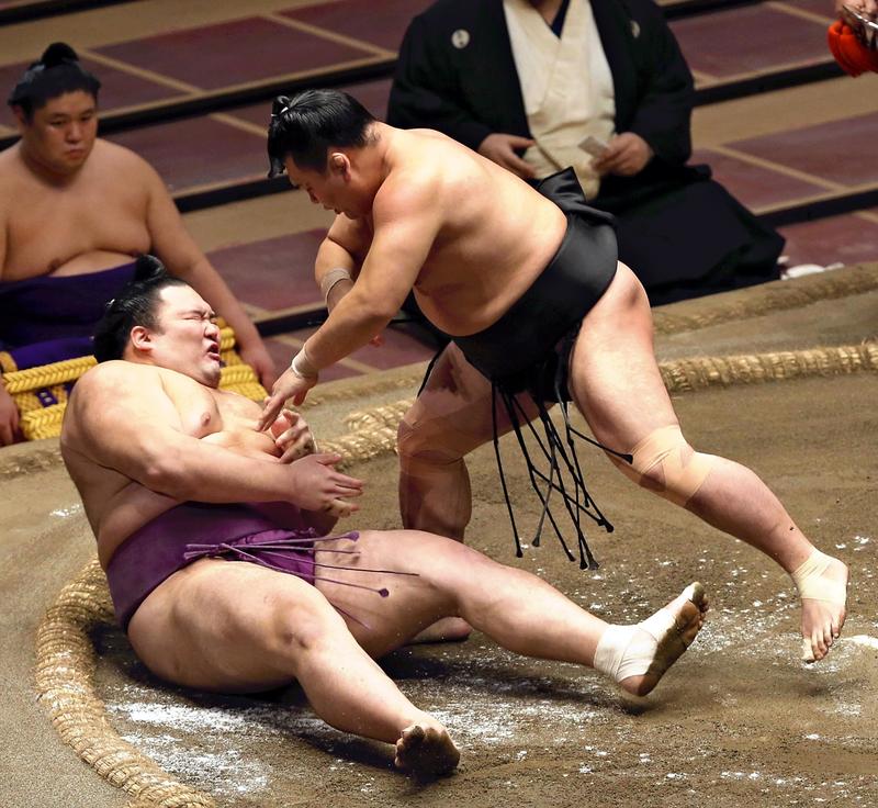 In terms of their opponents' size, fellow komusubi Okinoumi had to face the polar opposite in bulky No. 4 maegashira Aoiyama, but also came away with a victory after flooring the Bulgarian with a well-timed twist. Okimoumi improved to 9-5.