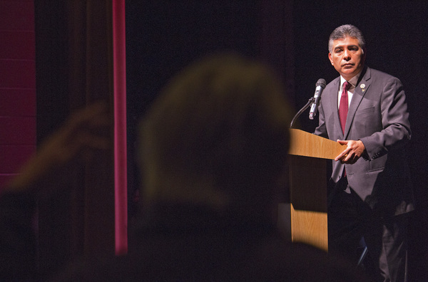 "Sign people up, get people involved," Rep. Tony Cardenas, D-Calif., exhorted a crowd of 300 crammed into an auditorium at the Cesar E. Chavez Learning Academies in Los Angeles' heavily Democratic San Fernando Valley.