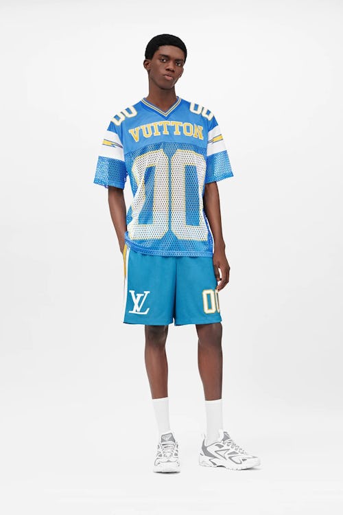 Look closely at the lightning bolt-striped shoulders and you’ll see the French luxury house is pulling from the Chargers circa the ‘00s and ‘70s instead of today. “Vuitton” appears both across the chest and back, while the number “00” is printed beneath the branding and on the shoulders. See-through mesh will have you showing more skin than your standard league-issue jersey — meaning the flex doesn’t stop at how much you spent.