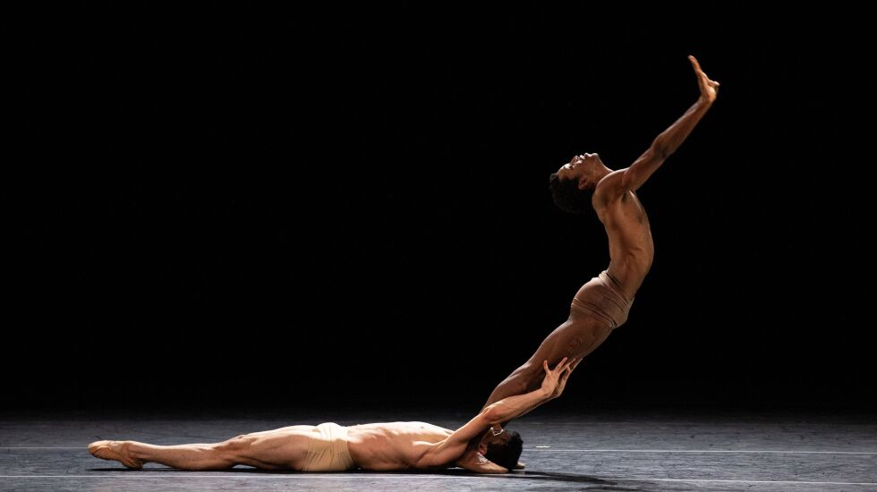 But nothing is certain, especially not safety, in a setting that always seems one flashlight beam from discovery. The two seem persistently aware that they are, in the eyes of many, a danger. The telegraphing of tenderness and mutual respect between these two individuals longing for touch is quite moving. Calvin Royal III and Joaõ Menegussi, who originated the roles for the pas de deux in New York, are superb dancers, at the same time powerfully athletic and acutely sensitive to refinements of detail.