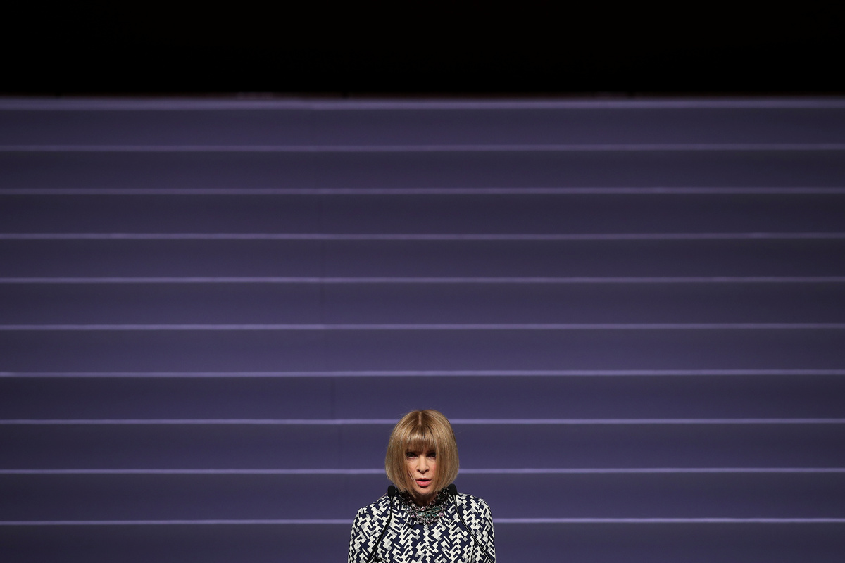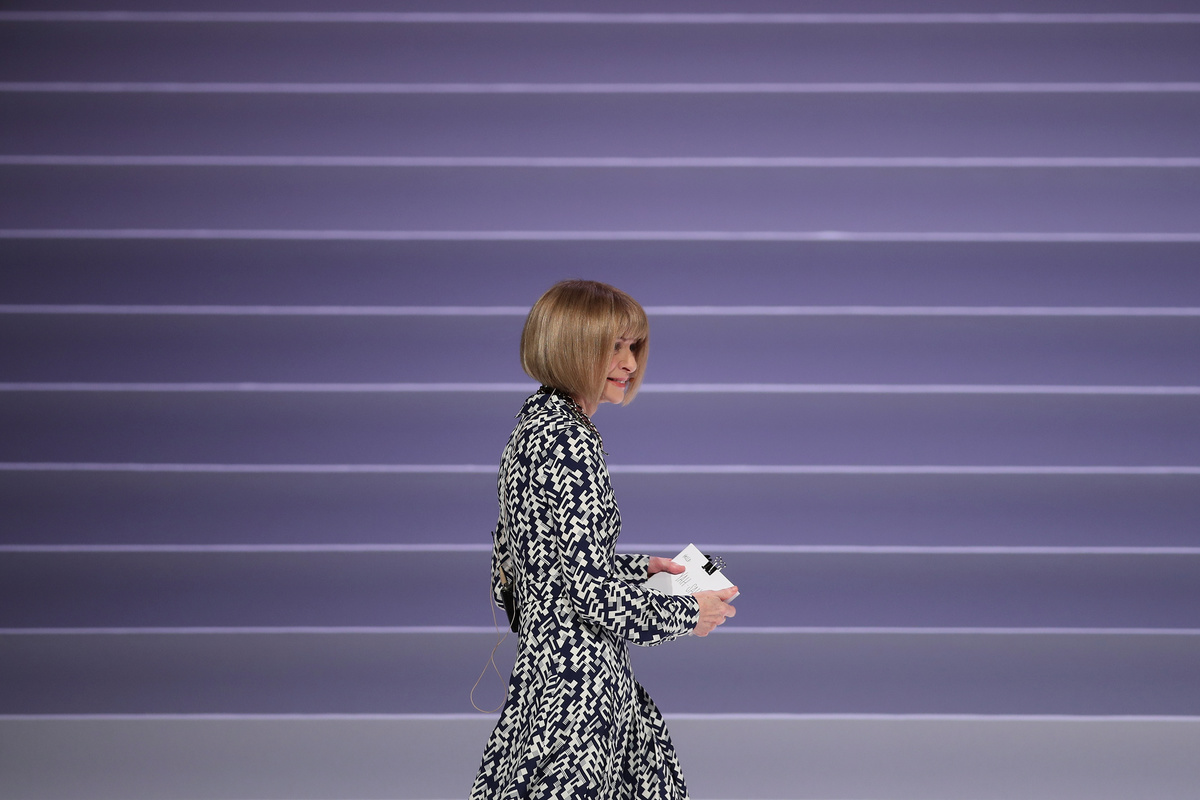Instantly recognizable with her short fringed bob haircut and sunglasses, British-born Wintour has long been a front row staple at catwalk shows.