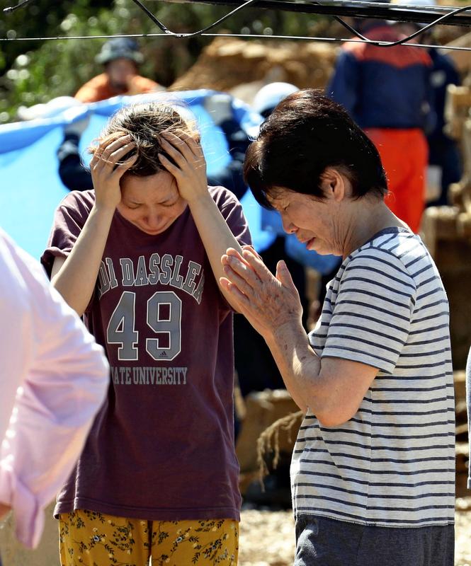 Houses that were swept into the sea by a landslide in the Yoshidacho district of Uwajima, Ehime Prefecture, are seen on Monday. (Credit: The Yomiuri Shimbun)A woman, left, grieves for a lost relative in Uwajima, Ehime Prefecture, on Monday. (Credit: The Yomiuri Shimbun)Rescuers lift a person who was stranded at a flooded hospital into a helicopter in the Mabicho district of Kurashiki, Okayama Prefecture, on Sunday. (Credit: The Yomiuri Shimbun)