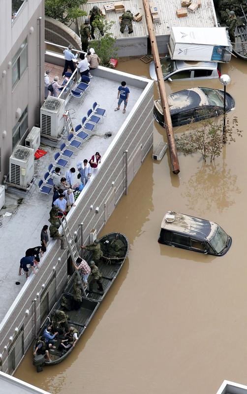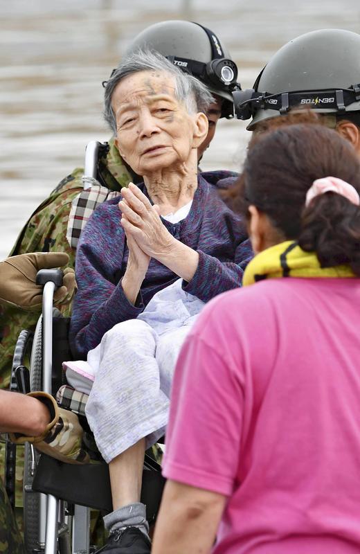 An elderly woman rides in a boat after being rescued by Self-Defense Forces personnel in the Mabicho district of Kurashiki, Okayama Prefecture, on Sunday. (Credit: The Yomiuri Shimbun)A person who was stranded at a hospital climbs down a ladder into a boat as others wait in the Mabicho district of Kurashiki, Okayama Prefecture, on Sunday. (Credit: The Yomiuri Shimbun)