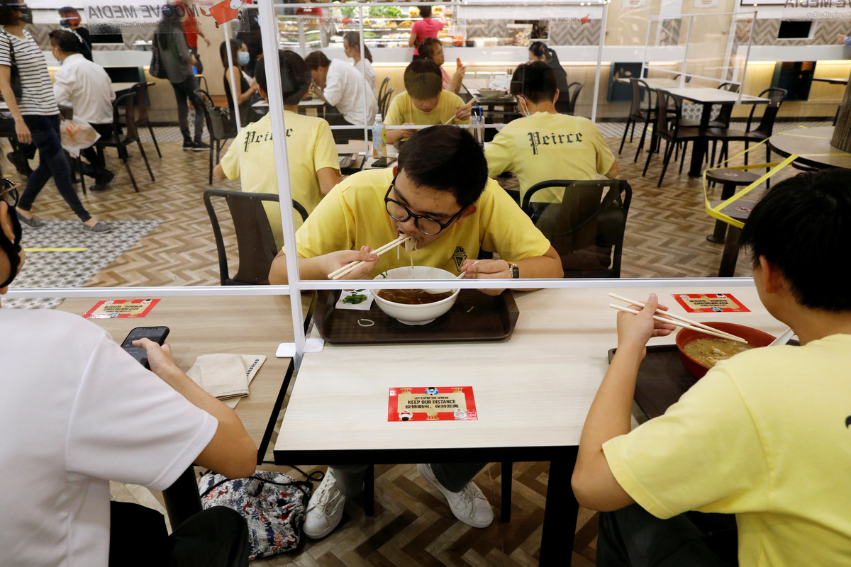 People eat at a table installed with plexiglass dividers at a food court in Singapore as the city state reopens the economy amid the coronavirus disease (COVID-19) outbreak, June 19, 2020. REUTERS/Edgar Su