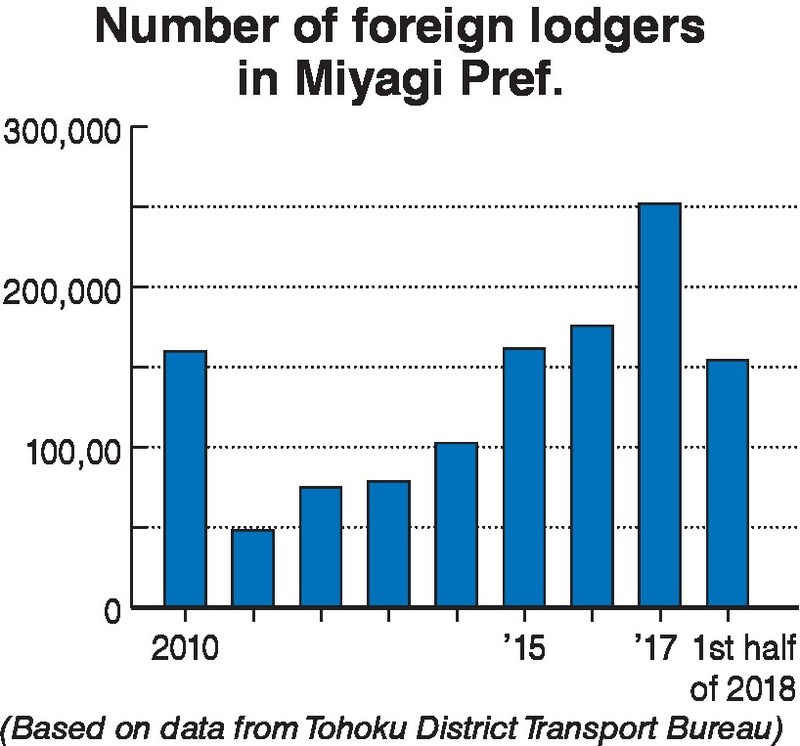 Thirty-four percent of the foreign visitors to the prefecture are Taiwanese, with that figure in 2017 increasing to 2.4 times the figure in 2010. Meanwhile, the numbers of visitors from South Korea and Hong Kong have not fully recovered, with 74 percent and 35.5 percent of the figures in 2010, respectively, actually visiting Miyagi.