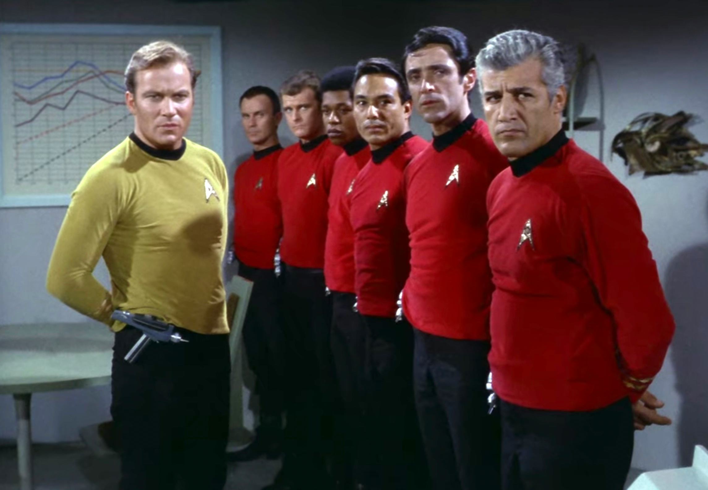 This is why Uhura and Scotty wore red. But, because of that last category — security — the extra muscle sent to deal with rough aliens, Klingons, space gods, and rock monsters, also wore red. That’s why a bunch of guys who got slaughtered by the Horta in “Devil in the Dark” had red shirts.