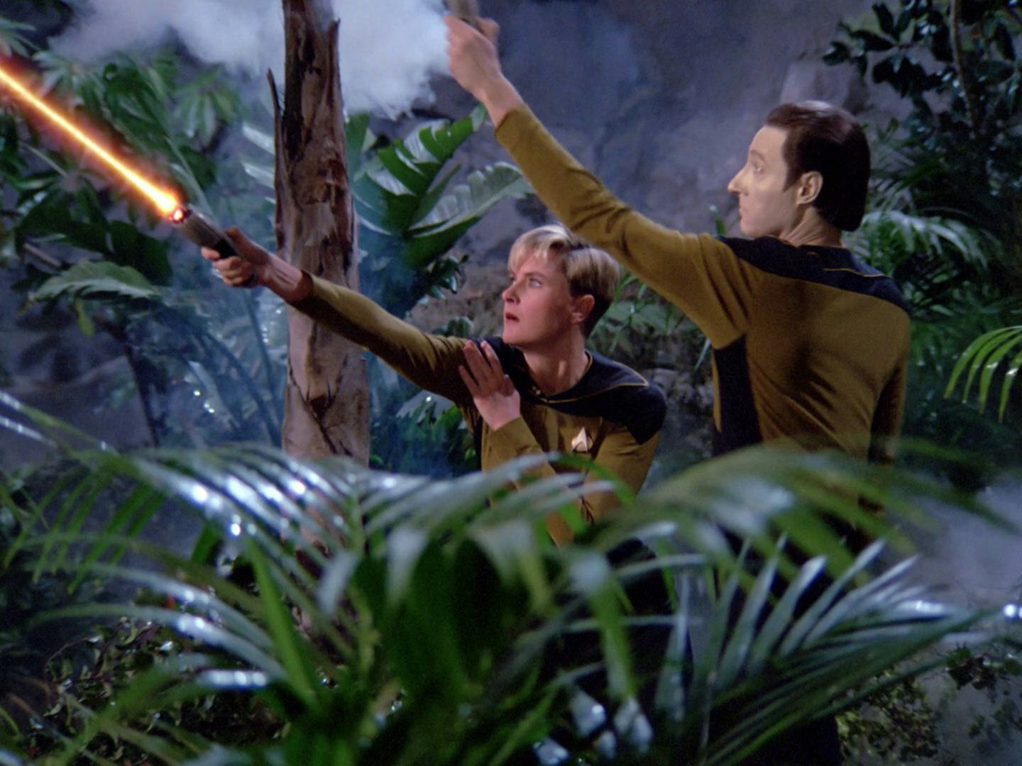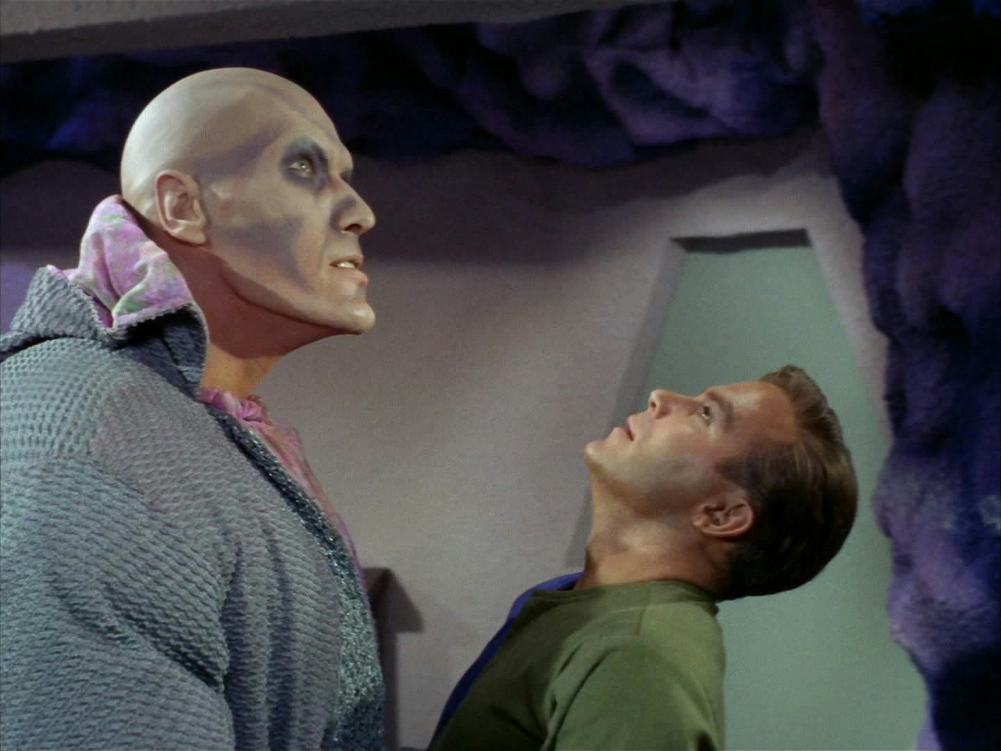 In the latter — one of the very first episodes of TOS — a huge android named Ruk (Ted Cassidy) murders red-shirted security officers, and later nearly murders Kirk. Obviously, Ruk can’t kill Kirk, because Kirk is the main character, and the writing simply won’t allow him to die. But in The Original Series, with very rare exceptions, the danger faced by the main characters (Kirk, Uhura, Sulu, et al.) is heightened when guest characters — “redshirts” — die first.
