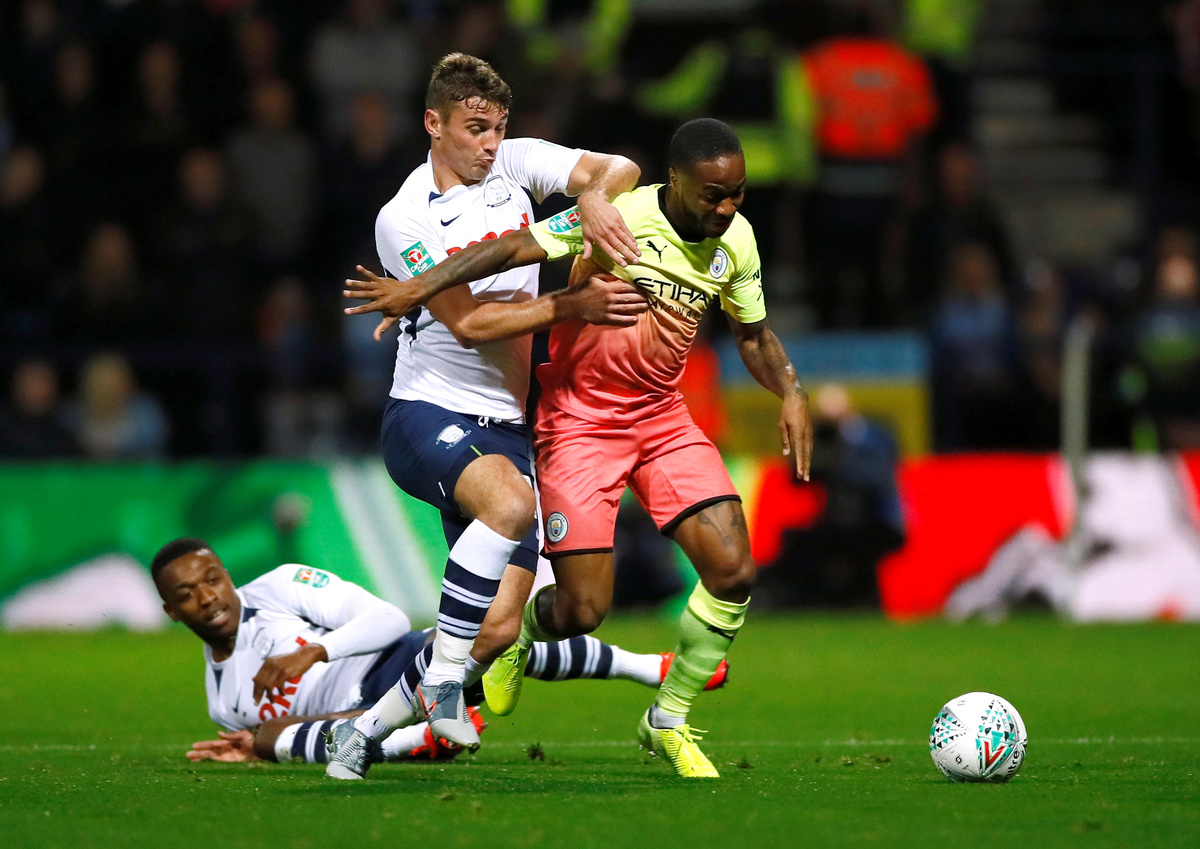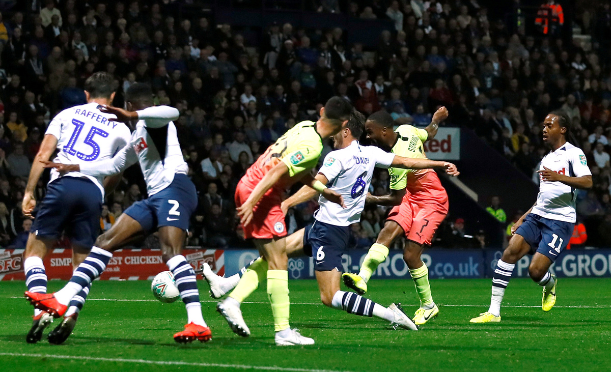 While an abject Spurs side sank after a goalless 90 minutes to the lowest-ranked side in the draw, holders Manchester City powered past second-tier Preston North End 3-0 with forward Raheem Sterling scoring the opener and setting up another.