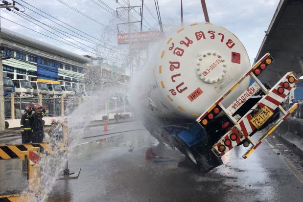 SAMUT PRAKAN: A tanker truck hauling about 6,000 litres of liquefied petroleum gas (LPG) overturned on Bang Na-Trat Road in Bang Phli district on Saturday morning, temporarily halting traffic. No gas leaks were reported.