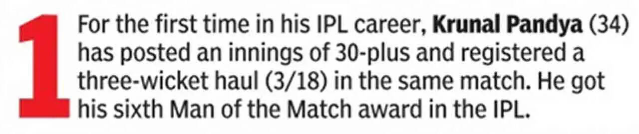 Krunal's bowling spell of 3/18 set the tone for the game at LSG succeeded in restricting SRH to 121 runs at the loss of eight wickets. Krunal also scored 34 runs off 23 deliveries, making LSG's chase an easy affair.
