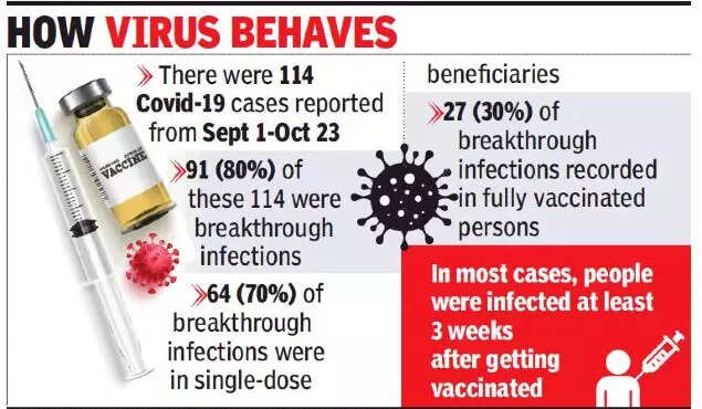 Nearly 80% (91 out of 114) Covid-19 cases reported from September 1 till October 23 were of breakthrough infection, revealed the data accessed by TOI from the office of chief medical officers.