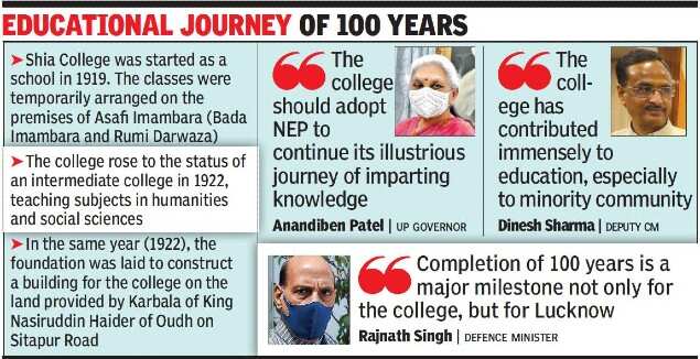 “Completion of 100 years of Shia PG college is a major milestone not only for the college but also for Lucknow. The college has successfully completed its journey of imparting quality education which reflects that its foundation was laid strong and the people who have taken it ahead were honest in their efforts,” said the defence minister. He said: “I appeal to students that along with efforts to achieve their goals they should also work for the development and growth of the country.”
