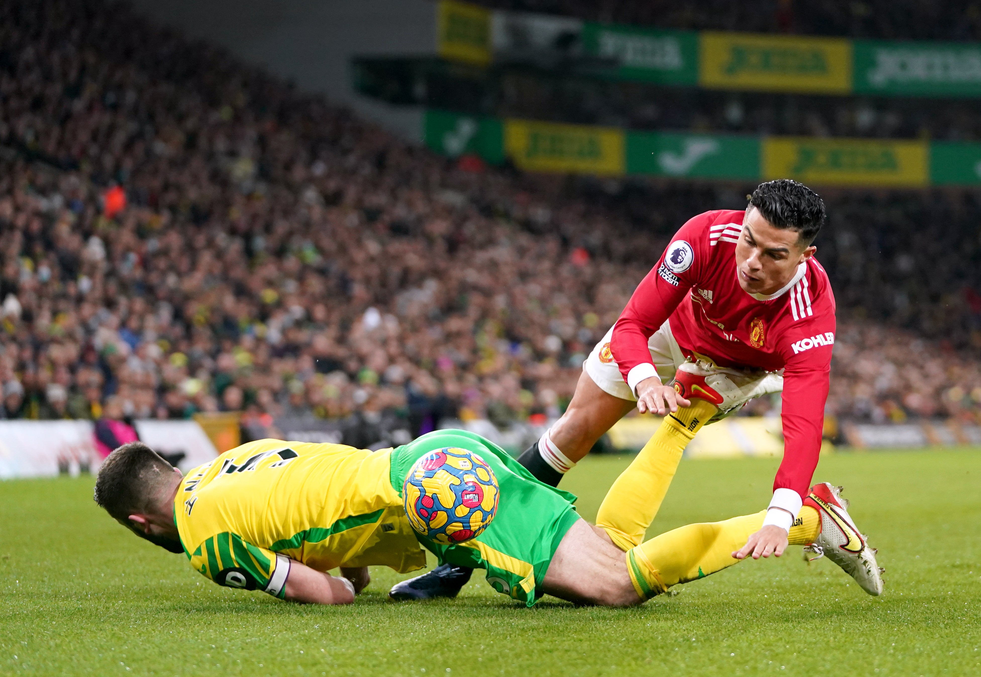 Scott McTominay carried the ball forward and played in Ronaldo before United’s number seven faked to shoot, checked back once more and then saw Tim Krul equal to his left-footed strike from 12 yards.