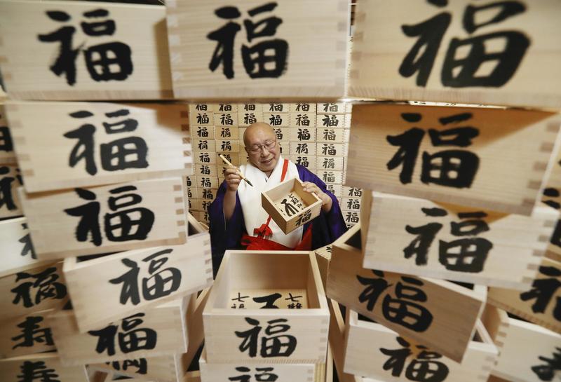 In the priest's quarters -- where the 1.8-liter-capacity wooden containers are piled up and the air is filled with the aroma of hinoki Japanese cypress produced in the Tono region of Gifu Prefecture -- temple priest Jissho Hasegawa, 70, carefully writes kanji characters on the boxes. The characters include "fuku" (luck) and "kotobuki" (congratulations or longevity) as well as a set that means "extinguishing troubles and bestowing happiness." The priest said he plans to complete 2,500 boxes this month.