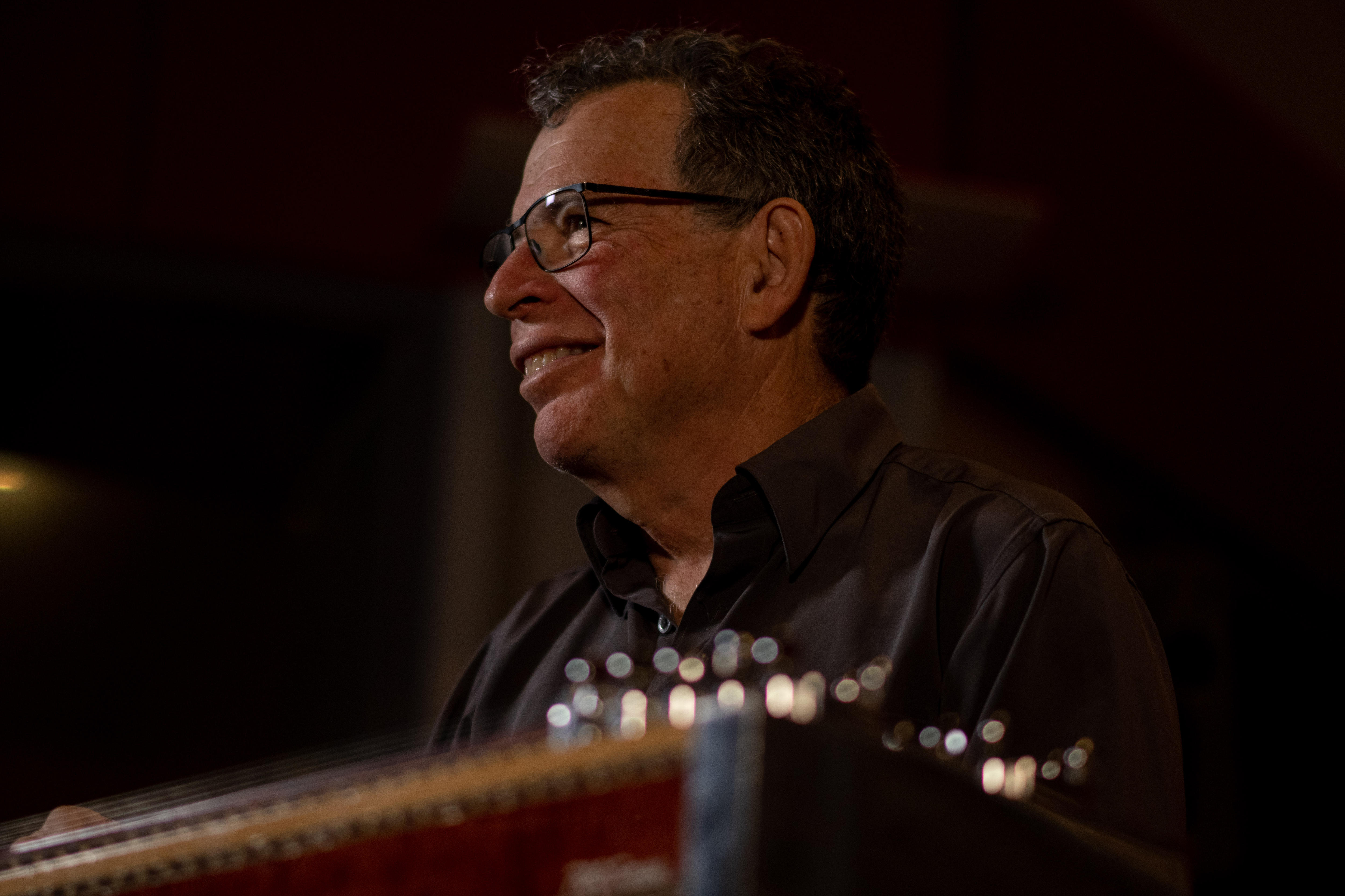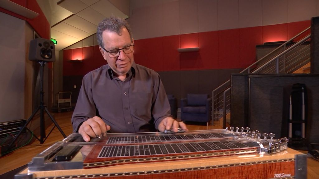 It's a challenging instrument with strings on top, pedals below and levers that are operated with his knees.