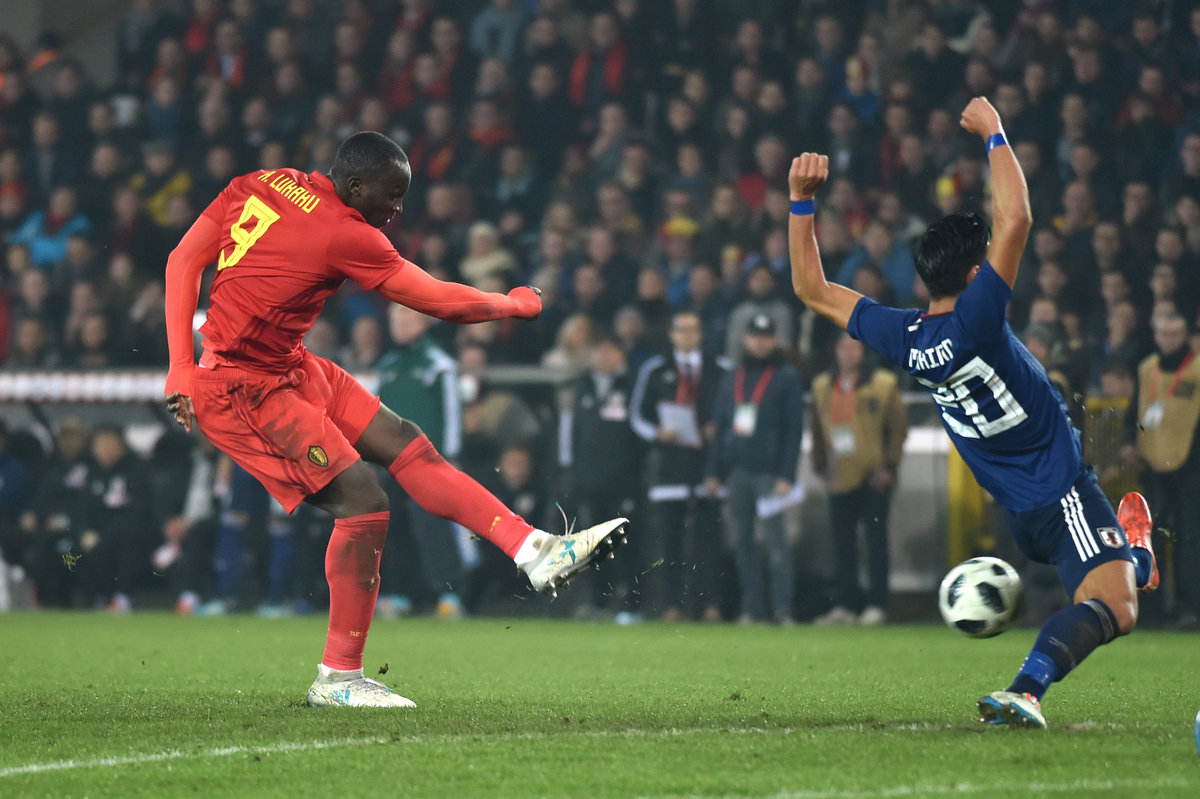 Soccer Football - International Friendly - Belgium v Japan - Jan Breydel Stadium, Bruges, Belgium - November 14, 2017 Belgium’s Romelu Lukaku shoots at goal as Japan’s Tomoaki Makino attempts to block REUTERS/Eric Vidal