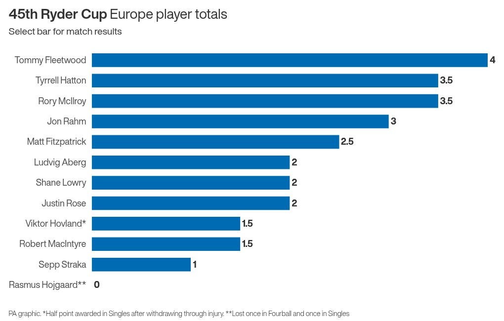 The rest of Europe’s points came in halves after the big guns of Rory McIlroy, Tommy Fleetwood, Justin Rose and Rahm were all beaten.