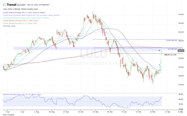 Specifically, I’m watching the $375 to $385 area. In this zone, a bevy of measures and levels come into play for Lululemon stock.