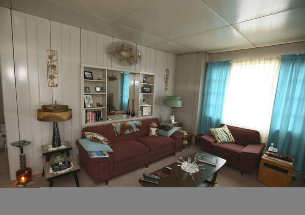 The images show the diversity of people who live in Lustron homes. There's an elderly couple holding hands on their early-American sofa. There are two women seated in an artfully decorated dinette, a contemporary drum light fixture suspended overhead. There's a middle-aged man sitting in a living room devoid of decoration, walls shabby and a lamp lying broken beneath a worn chair.