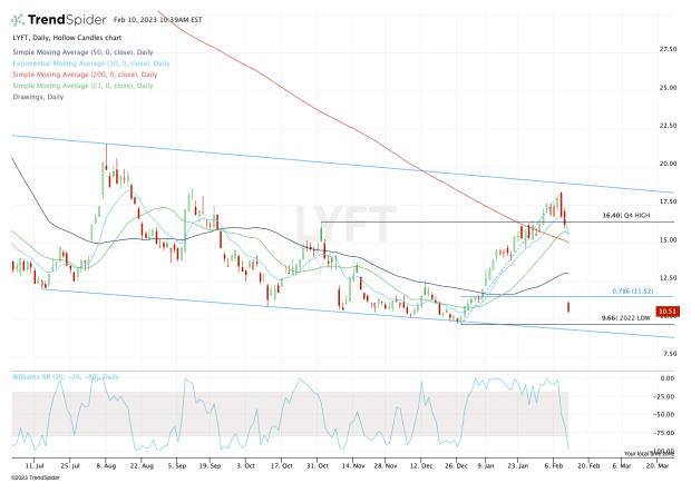 The move has sent Lyft stock gapping below the 10-day, 21-day, 50-day and 200-day moving averages. It also gapped below the 50%, 61.8% and 78.6% retracements.
