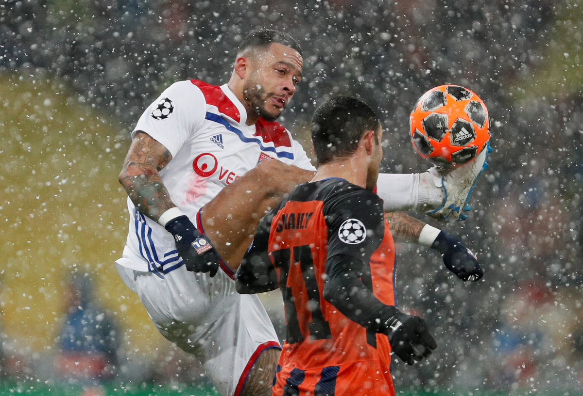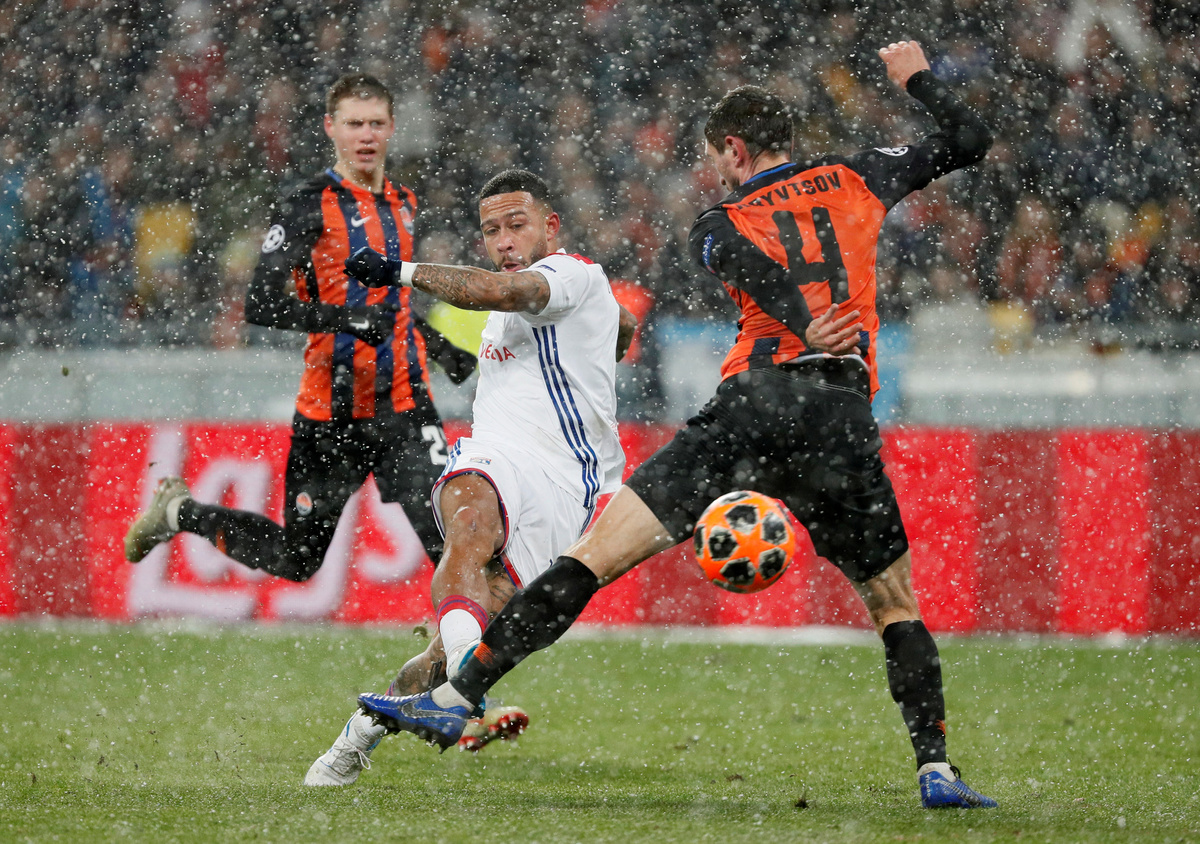 Soccer Football - Champions League - Group Stage - Group F - Shakhtar Donetsk v Olympique Lyonnais - NSC Olimpiyskiy Stadium, Kiev, Ukraine - December 12, 2018 Lyon's Lucas Tousart in action with Shakhtar Donetsk's Viktor Kovalenko REUTERS/Gleb GaranichSoccer Football - Champions League - Group Stage - Group F - Shakhtar Donetsk v Olympique Lyonnais - NSC Olimpiyskiy Stadium, Kiev, Ukraine - December 12, 2018 Lyon's Nabil Fekir scores their first goal REUTERS/Valentyn OgirenkoSoccer Football - Champions League - Group Stage - Group F - Shakhtar Donetsk v Olympique Lyonnais - NSC Olimpiyskiy Stadium, Kiev, Ukraine - December 12, 2018 Lyon's Memphis Depay in action with Shakhtar Donetsk's Sergiy Kryvtsov REUTERS/Gleb Garanich