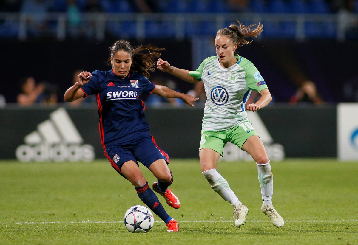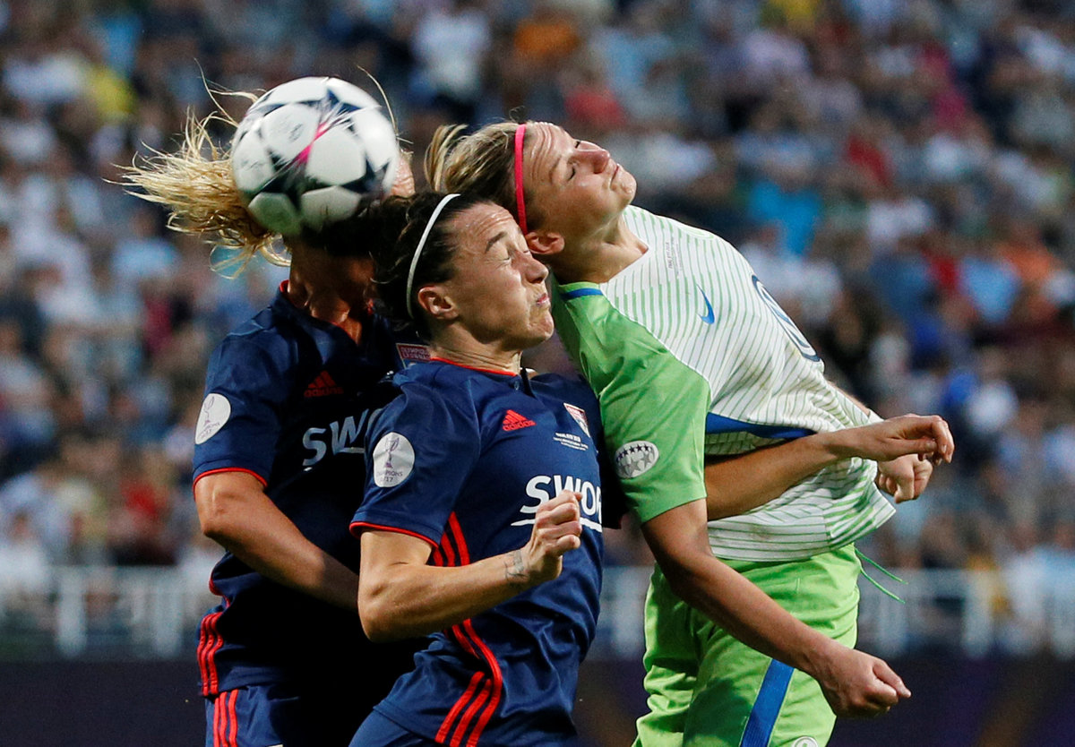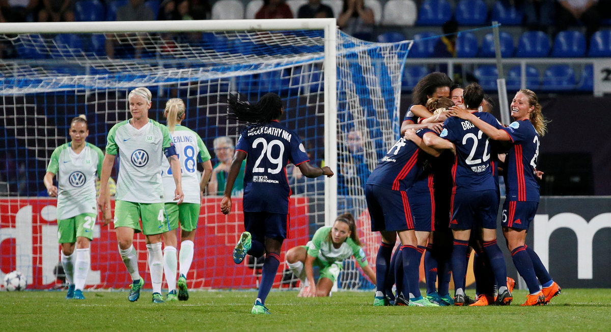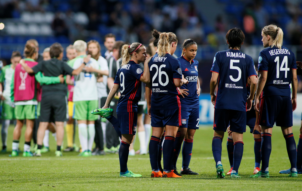 Soccer Football - Women's Champions League Final - Olympique Lyonnais vs VfL Wolfsburg - Valeriy Lobanovskyi Stadium, Kiev, Ukraine - May 24, 2018 Olympique Lyonnais' players before extra time REUTERS/Valentyn OgirenkoSoccer Football - Women's Champions League Final - Olympique Lyonnais vs VfL Wolfsburg - Valeriy Lobanovskyi Stadium, Kiev, Ukraine - May 24, 2018 Wolfsburg’s Tessa Wullaert in action with Lyon’s Amel Majri REUTERS/Valentyn OgirenkoSoccer Football - Women's Champions League Final - Olympique Lyonnais vs VfL Wolfsburg - Valeriy Lobanovskyi Stadium, Kiev, Ukraine - May 24, 2018 Wolfsburg coach Stephan Lerch looks on as Alexandra Popp makes a challenge leading to her being sent off REUTERS/Valentyn OgirenkoSoccer Football - Women's Champions League Final - Olympique Lyonnais vs VfL Wolfsburg - Valeriy Lobanovskyi Stadium, Kiev, Ukraine - May 24, 2018 Lyon’s Ada Hegerberg celebrates scoring their third goal REUTERS/Gleb GaranichSoccer Football - Women's Champions League Final - Olympique Lyonnais vs VfL Wolfsburg - Valeriy Lobanovskyi Stadium, Kiev, Ukraine - May 24, 2018 Wolfsburg’s Pernille Harder celebrates scoring their first goal REUTERS/Gleb GaranichSoccer Football - Women's Champions League Final - Olympique Lyonnais vs VfL Wolfsburg - Valeriy Lobanovskyi Stadium, Kiev, Ukraine - May 24, 2018 Lyon’s Lucy Bronze in action with Wolfsburg’s Alexandra Popp REUTERS/Gleb Garanich