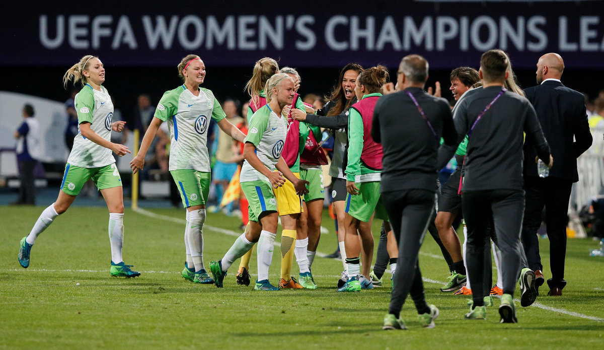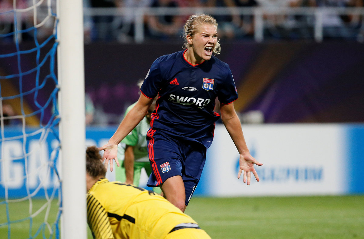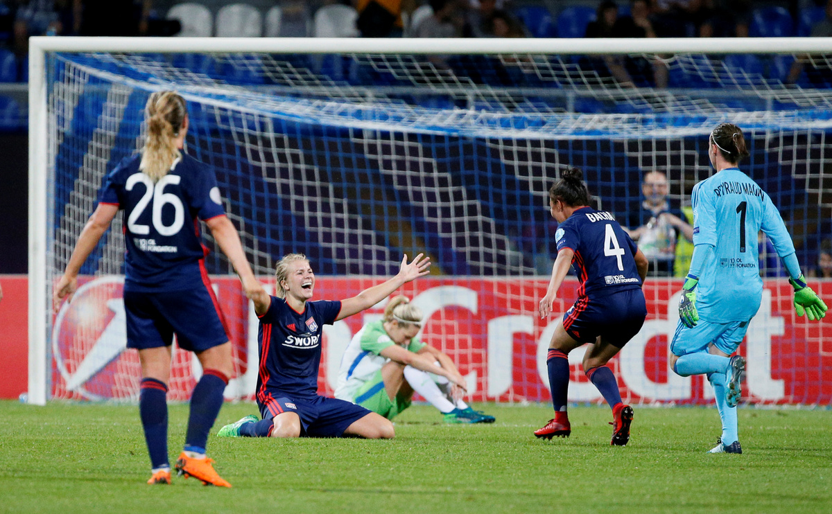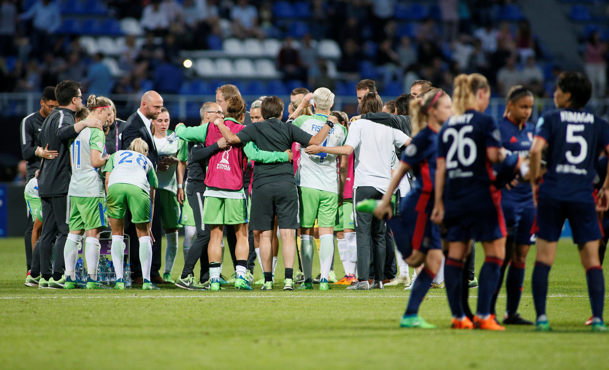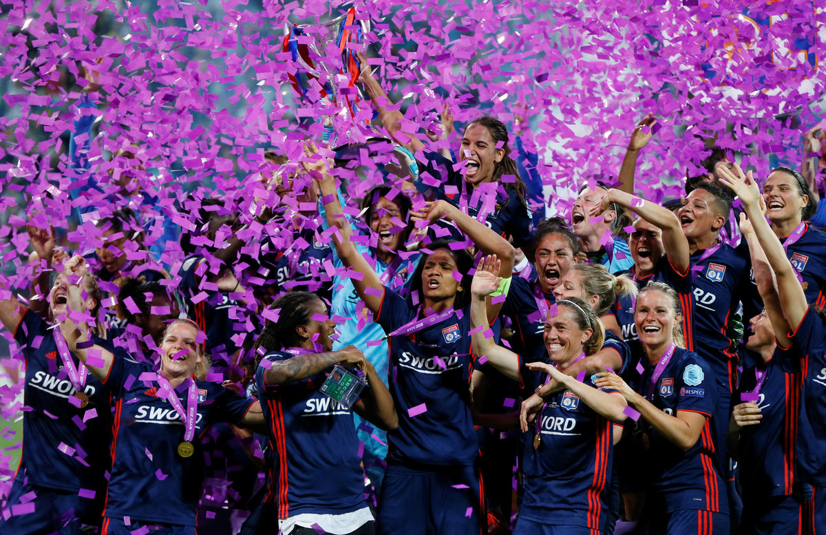 Soccer Football - Women's Champions League Final - Olympique Lyonnais vs VfL Wolfsburg - Valeriy Lobanovskyi Stadium, Kiev, Ukraine - May 24, 2018 Olympique Lyonnais' players before extra time REUTERS/Valentyn OgirenkoSoccer Football - Women's Champions League Final - Olympique Lyonnais vs VfL Wolfsburg - Valeriy Lobanovskyi Stadium, Kiev, Ukraine - May 24, 2018 Wolfsburg’s Tessa Wullaert in action with Lyon’s Amel Majri REUTERS/Valentyn OgirenkoSoccer Football - Women's Champions League Final - Olympique Lyonnais vs VfL Wolfsburg - Valeriy Lobanovskyi Stadium, Kiev, Ukraine - May 24, 2018 Wolfsburg coach Stephan Lerch looks on as Alexandra Popp makes a challenge leading to her being sent off REUTERS/Valentyn OgirenkoSoccer Football - Women's Champions League Final - Olympique Lyonnais vs VfL Wolfsburg - Valeriy Lobanovskyi Stadium, Kiev, Ukraine - May 24, 2018 Lyon’s Ada Hegerberg celebrates scoring their third goal REUTERS/Gleb GaranichSoccer Football - Women's Champions League Final - Olympique Lyonnais vs VfL Wolfsburg - Valeriy Lobanovskyi Stadium, Kiev, Ukraine - May 24, 2018 Wolfsburg’s Pernille Harder celebrates scoring their first goal REUTERS/Gleb GaranichSoccer Football - Women's Champions League Final - Olympique Lyonnais vs VfL Wolfsburg - Valeriy Lobanovskyi Stadium, Kiev, Ukraine - May 24, 2018 Lyon’s Lucy Bronze in action with Wolfsburg’s Alexandra Popp REUTERS/Gleb Garanich